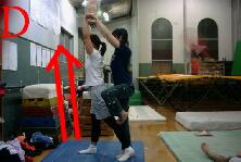Dの写真 本番の演技でショルダースタンドが上がらない原因のほとんどはこれです。 一度失敗して、慌てて再度上げようとしてまた失敗して・・・ よく見かけますが、これはこの写真のようにトップが肩に足を掛ける前に立ち上がってしまう為に失敗してしまうのです。 そんな時は慌てずにベースはトップの足が肩に掛かってから立ち上がりましょう。