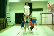 ショルダースタンドのクライミング(乗り方)はいろいろな方法がありますが、 写真1と2のようにセットをして、トップがベースを駆け上がるように、 乗込む方法が多く行われています。