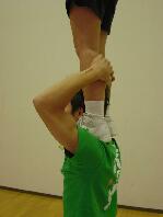 トップのふくらはぎの上部の「膨らみ始めた部分」に手がはまり易くなっています。 手の平全体でしっかりと支持し、トップの脛(スネ)を自分の後頭部に押し付けます。