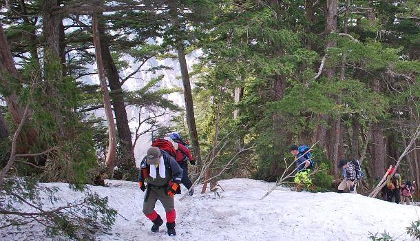 モナカ状の残雪はズボズボ、クラスト部を選んで登る 7:30