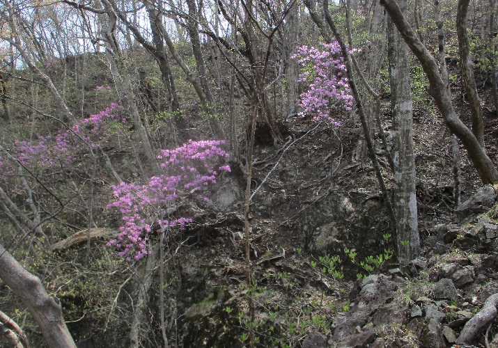 ミツバツツジ咲く稜線途中から返り見る鹿岳