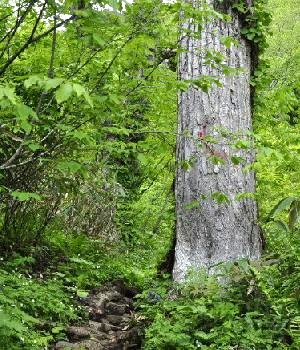 登山口から花盛りのトチの木と九頭竜山(左)を展望 |