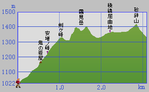 コース各地点の標高と区間距離 鬼ノ岩屋登山口:1022m ↓ 1.5km 霧見岳ピーク: 1400m ↓ 0.8km 稜線屈曲地: 1360m ↓ 0.7km 砂鉢山山頂: 1432m |