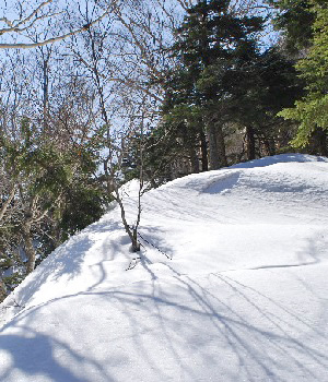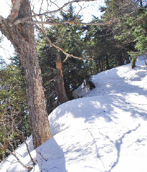 往路■石の湯登山口→(35分)→沢登り取り付き→(25分)→稜線コル分岐→(40分)→小坊寺山山頂 復路■小坊寺山山頂→(30分)→坊主岩→(40分)→稜線下降点→(20分)→石の湯下山口(駐車地) 積雪期&残雪期の坊寺山は今日で13度訪れましたが、単独での縦走は今回が初めてでした。 過去(9年前)一度、積雪期単独で登頂しましたが、その時は山頂ピストンです。坊主岩越えは 単独では絶対無理と思っていたからです。 ロープ、アイゼン他、残雪登攀装備で今回もまた気持ちが抑えてくれた時点で 引き返そうと左回りルートをまず稜線コル分岐に向かいます。しかし登山口から沢登り取り付き地点、さらに稜線コル分岐までは トレースどころか道標類は一切ありませんので初心者&未踏の場合は、単独登攀は控えるか、 またルートファインディングで沢登り取り付き地点まで辿れないようだったら止めるべきでしょう。 (残雪期の小坊寺山に限り、GPSや地形図をあんまりあてにしないほうが良いかも知れません) 間違えずに何とか稜線コル分岐に辿りつきました。 稜線コル分岐からほどなくすると、いよいよ最初の難関が現れます。斜度35度強の雪稜が100mほど延びていましたので、 ここを「鼻突き一丁坂」と呼ぶことにしました。(※胸突き八丁ではありません。八丁=約900m) 50mほど登った辺りで立ち止まりましたが、 とても振り返る気持ちになりません、大きく深呼吸(ため息かも知れませんが)をしただけです。 一年ぶりの山頂に無事登頂しました。 山頂は春の心地よい微風、装備&体調も順風、縦走実施です。 |