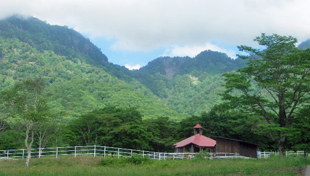 牧場を通過して戸隠山登山道に入る、中央鞍部が一不動 |