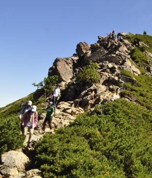 仙丈ヶ岳山頂目前、前方岩頭を右に巻く onMouse山頂は人だかり |