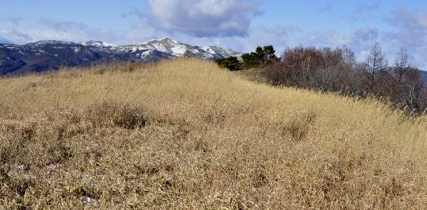稜線に近ずくにつれ陽当りが良く、雪どころじゃないカヤト原 |