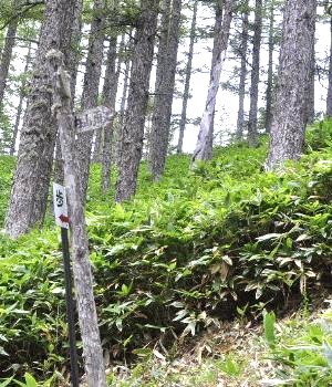 このカラマツ老木を見ると、カラマツ林から抜ける |