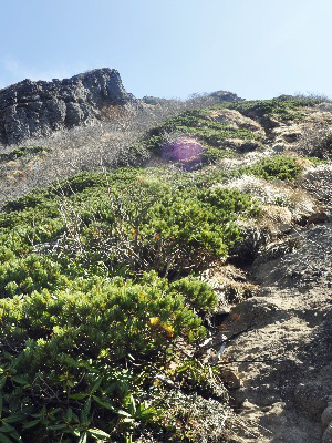ハイマツ帯を抜け、振り返り摩利支天岩峰を見る