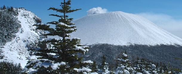 縞筋が見えないほどの積雪、前掛山(手前)と噴煙上がる釜山