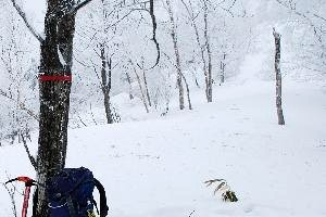 九十九番石仏登山口→(60分)→コンコン平分岐→(30分)→角間峠→(60分)→1950m小ピーク 1950m小ピーク・往路下山→(30分)→角間峠→(50分)→九十九番石仏下山口 登山口から角間峠までは緩やかな傾斜なのでスノーシューのほうが良いと思う。しかし角間峠から湯ノ丸山北峰に 向う東尾根はスノーシューイングエリアではないので、ここでカンジキに履き替え、スノーシュー&ストックは角 間峠にデポすることが望ましい。強風と低温は八ヶ岳に匹敵するが、岩場やヤセ尾根がないのでロープワークは不 要。しかし深雪ラッセル登攀は覚悟したほうが良いだろう。 |