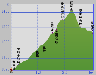 荒船不動コース行程&断面図 荒船不動登山口:1020m ↓ 0.0km 星尾峠分岐地:1270m ↓ 0.0km 経塚山山頂:1423m ■登山口と山頂までの標高差:約 400m ■登山口から山頂までの距離:約2300m ■駐車地:荒船不動登山口駐車場に10台程 ■トイレ:不動尊境内に参拝客用公衆トイレ |