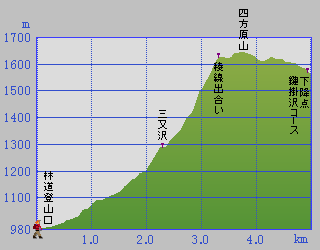 馬返(古谷ダム)コース 林道登山口: 980m ↓ 0.0km 三俣沢出合: 1030m ↓ 0.0km 稜線出合い: 1620m ↓ 0.0km 四方原山山頂:1632m ■登山口と山頂までの標高差:約 650m ■登山口から山頂までの距離:約0000m ■駐車地:○○○○○○○○○○○○○○○ ■トイレ:○○○○○○○○○○○○○○○ |