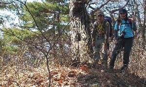 159.大嵐山 12月2日(木)天候:晴れ・PV山行・2名 今年2月24日、奥象山コースで鞍骨山に行 った時、稜線分岐で左方に延びる尾根があっ た。近いうちに辿ってみようと思っていたが 結局、九ヶ月も経ってしまった。地図上で辿 り着く山は、二日前に訪れた戸神山と解かっ ていたが、稜線間にある三つのピークを知り たくて、急遽DAN大室山氏に同行してもら い大嵐山ピークに辿り着くことができた。 |